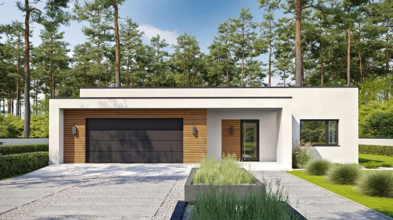 Крытая парковка на два автомобиля подходит к входной группе. Большой холл имеет панорамное остекление и необычную зону хранения в центре комнаты.